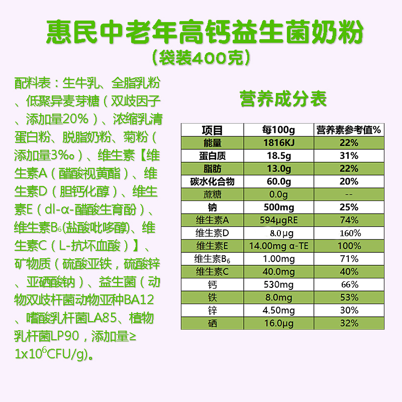 生牛乳、浓缩乳清卵白粉、低聚异麦芽糖(双歧因子、添加量20%)、菊粉(添加量3‰)、维生素【维生素A(醋酸视黄酯)、维生素D(胆钙化醇)、维生素E(dl-α-醋酸生育酚)、维生素B6(盐酸吡哆醇)、维生素C(L-抗坏血酸)】、矿物质(硫酸亚铁,硫酸锌、亚硒酸钠)、双歧杆菌Bb-12益生菌(添加量1x106CFU/g)。